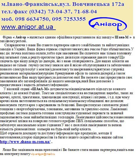 Фірма «Анігор» являється єдиним офіційним представником від заводу «Шана-М» в західному регіоні.
