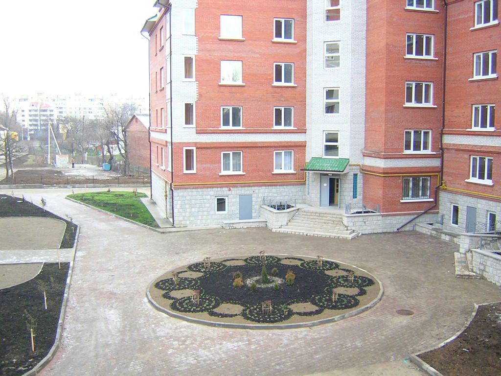 При виконанні благоустрою прибудинкової території тротуари, пішохідні доріжки вистеляються тротуарною плиткою, розбиваються клумби, газони, дитячі майданчики із встановленням малих архітектурних форм; територія огороджується декоративним металевим парканом.